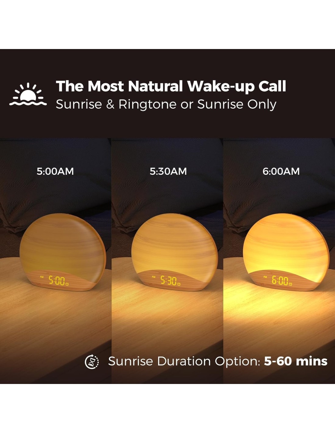 - Lumière progressive 30 minutes avant l’alarme